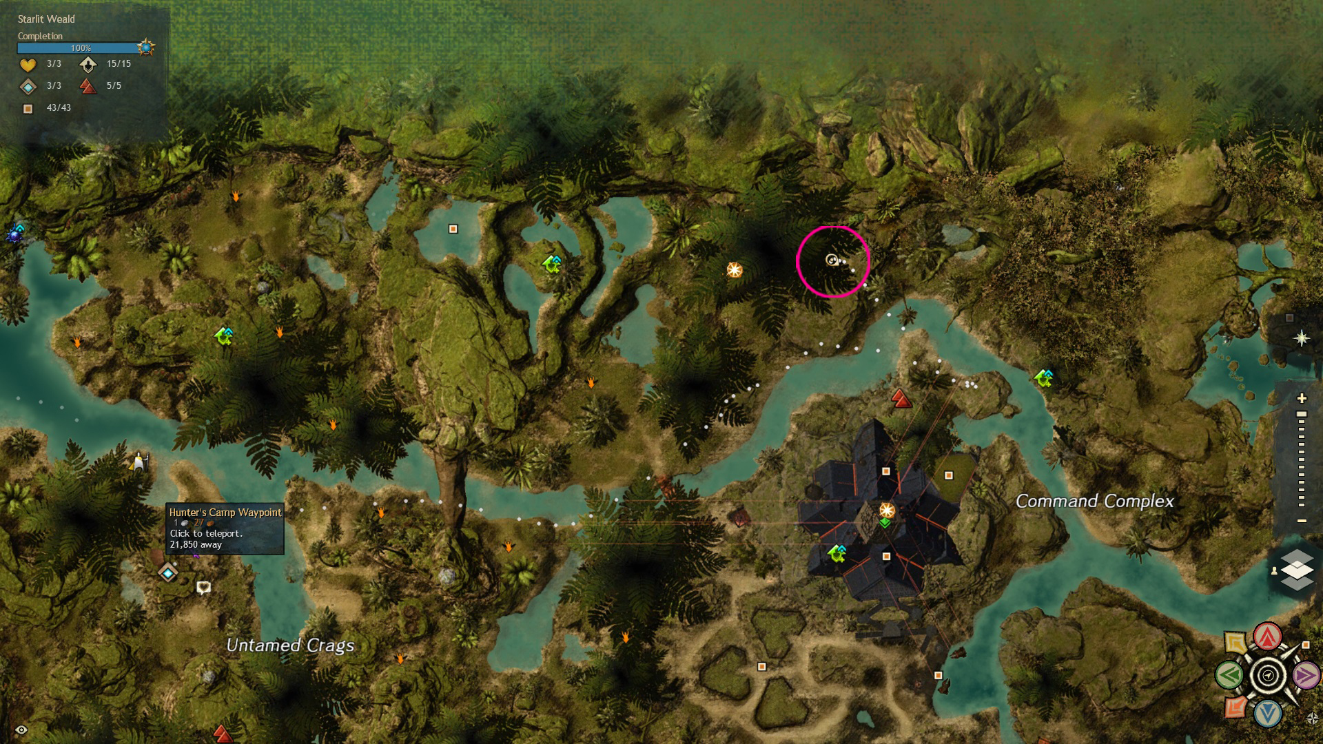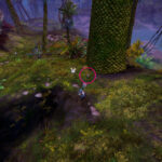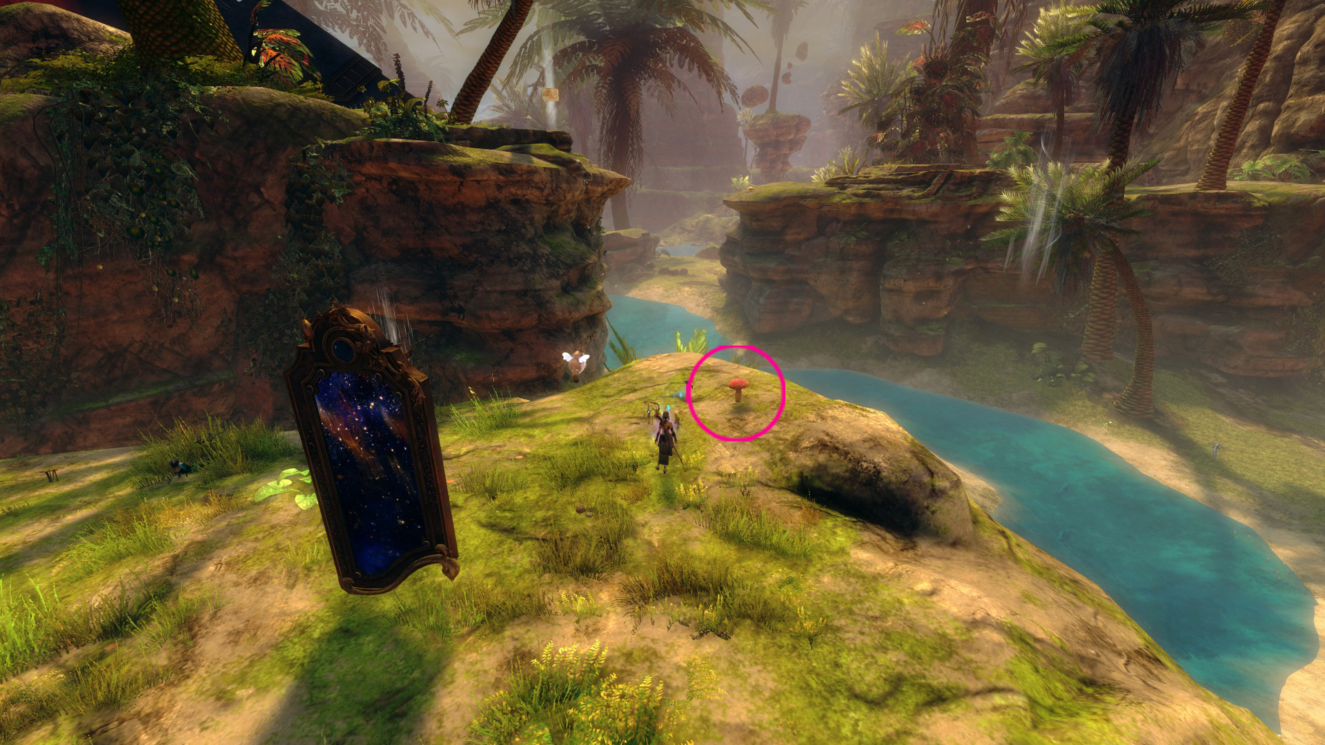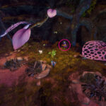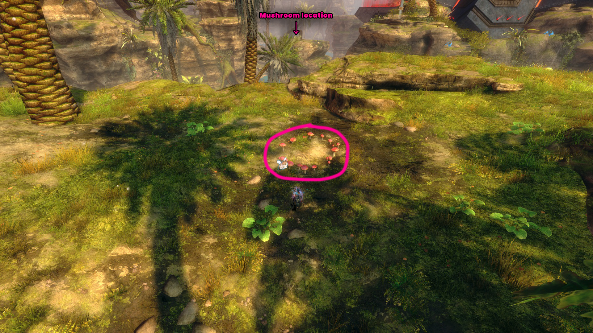 Go to the Hunter’s Camp Waypoint – [&BIoPAAA=], then head west, slightly north. You’ll find the red mushroom on a cliff near the Command Complex Vista – [&BJIPAAA=], and the red mushroom ring is just northwest of the mushroom, across the river.