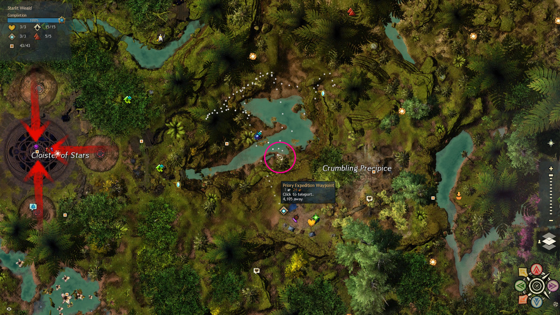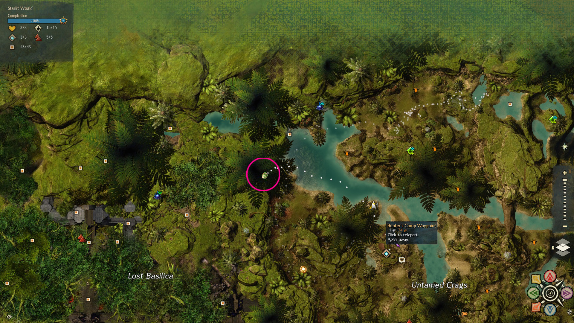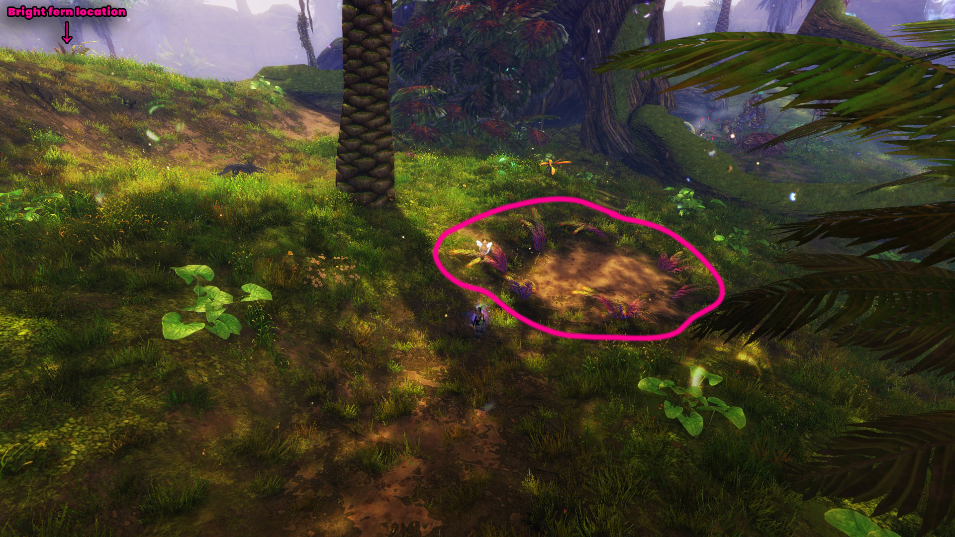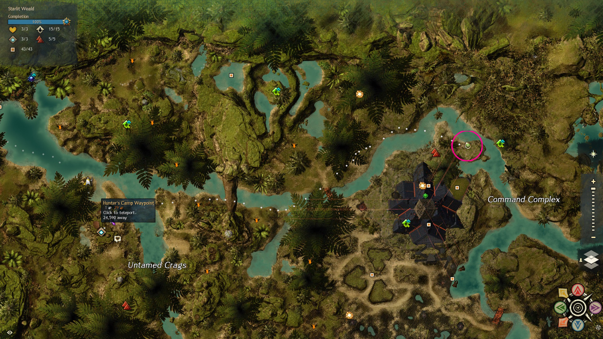 Go to the Hunter’s Camp Waypoint – [&BIoPAAA=], then head west, slightly north. You’ll find the red mushroom on a cliff near the Command Complex Vista – [&BJIPAAA=], and the red mushroom ring is just northwest of the mushroom, across the river.
