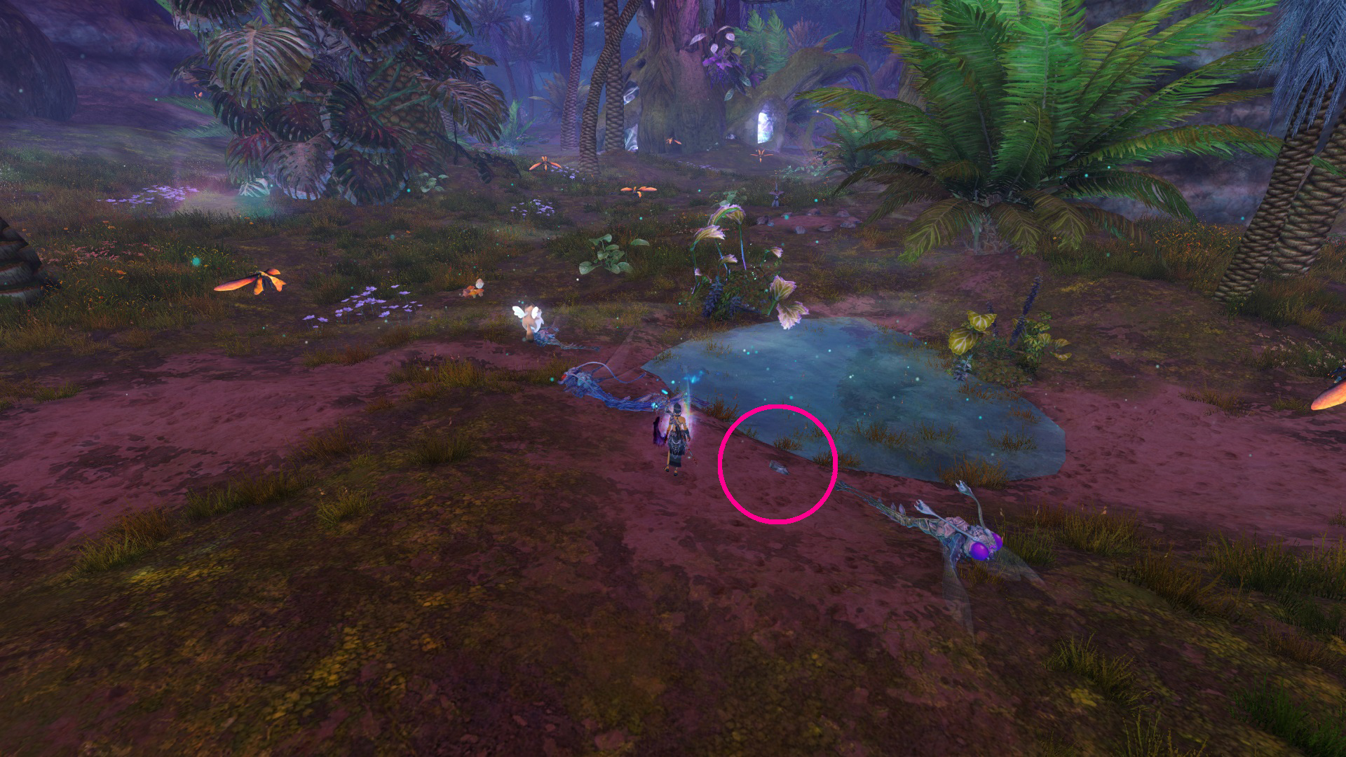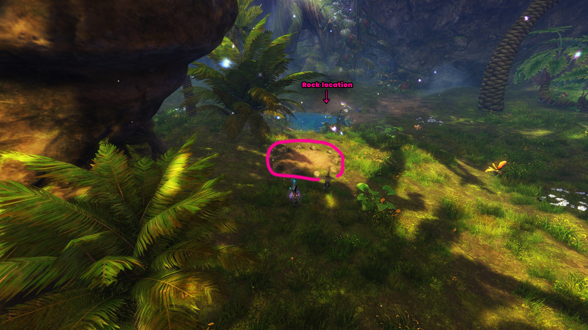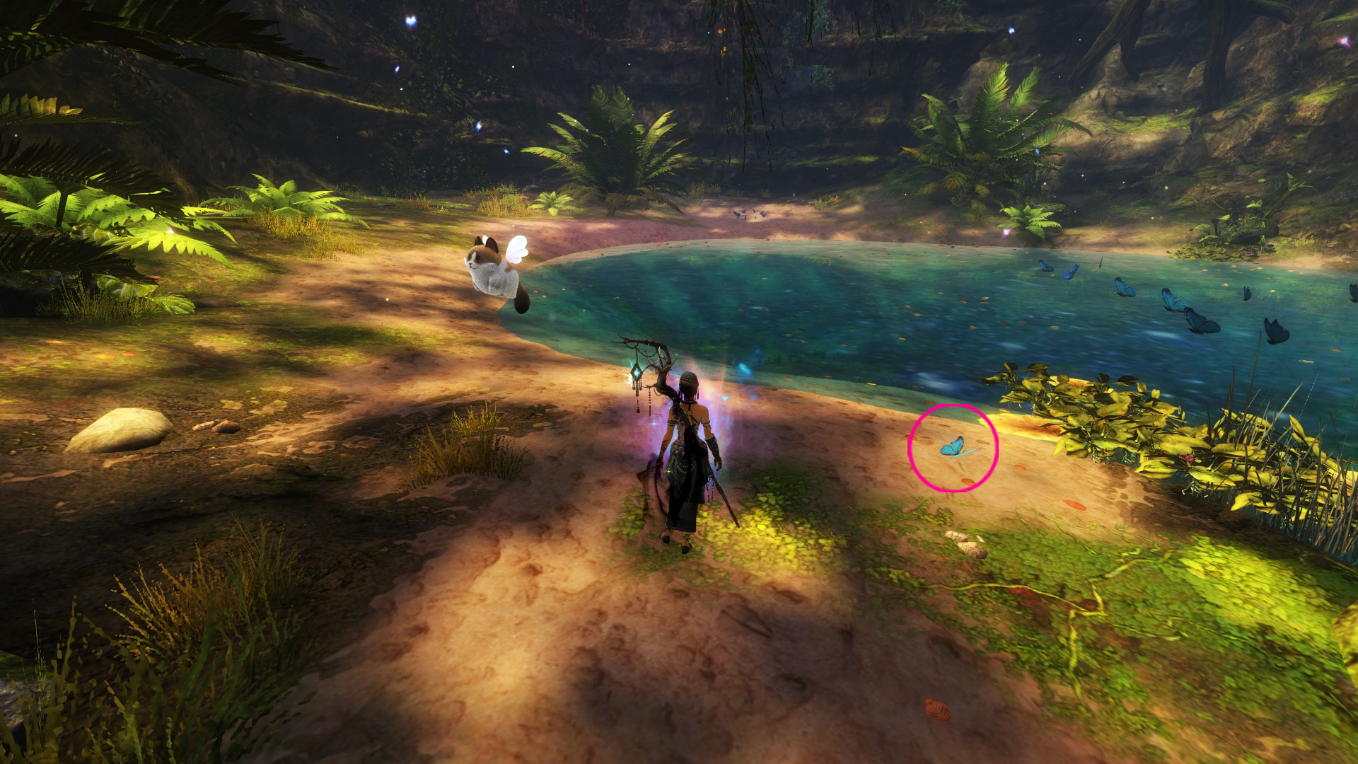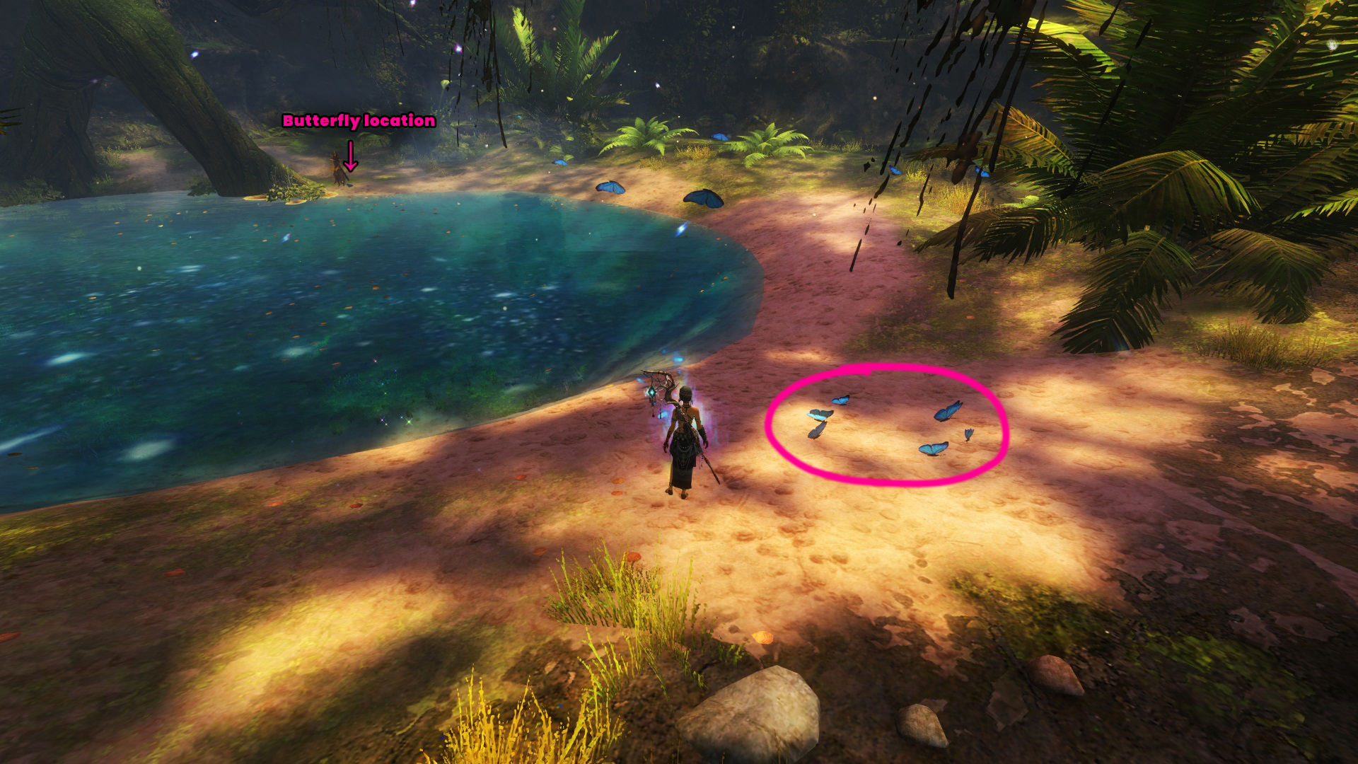 Go to the Hunter’s Camp Waypoint – [&BIoPAAA=], then head slightly northwest to an underwater tunnel. Once you’re a bit into the tunnel, swim to the right into a hole. Inside, you’ll find a small cave at the Grotto of Spirits point of interest – [&BLoPAAA=], containing the butterfly, with the butterfly ring located on the opposite side of the little pond.
