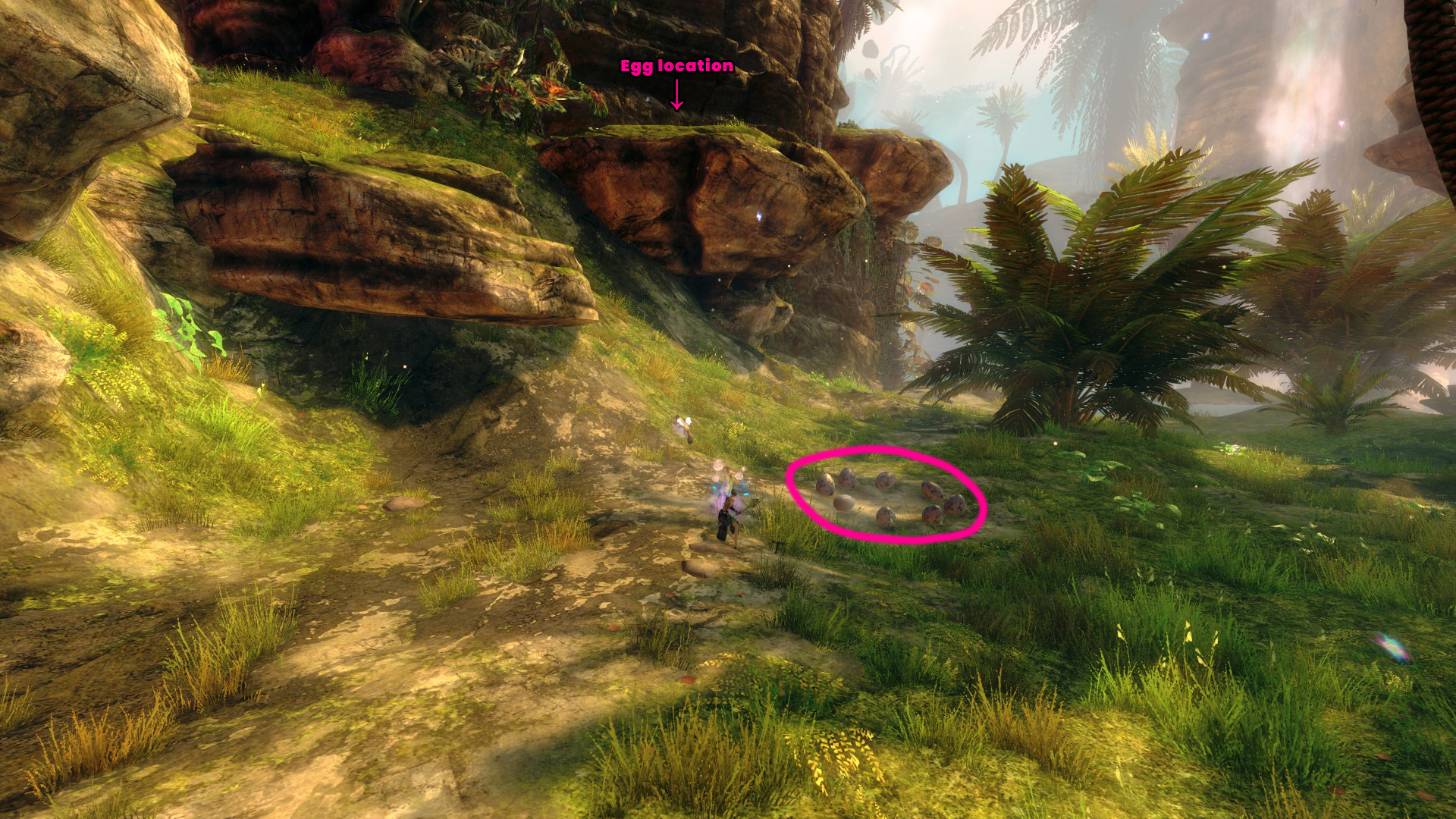 From the Hunter’s Camp Waypoint – [&BIoPAAA=], head straight north. The saurian egg is on a small cliff, and the ring is just below it, slightly to the northeast.