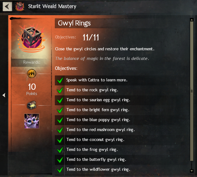 Completing all 11 steps rewards you with the Gwyldell minipet and 10 achievement points.
